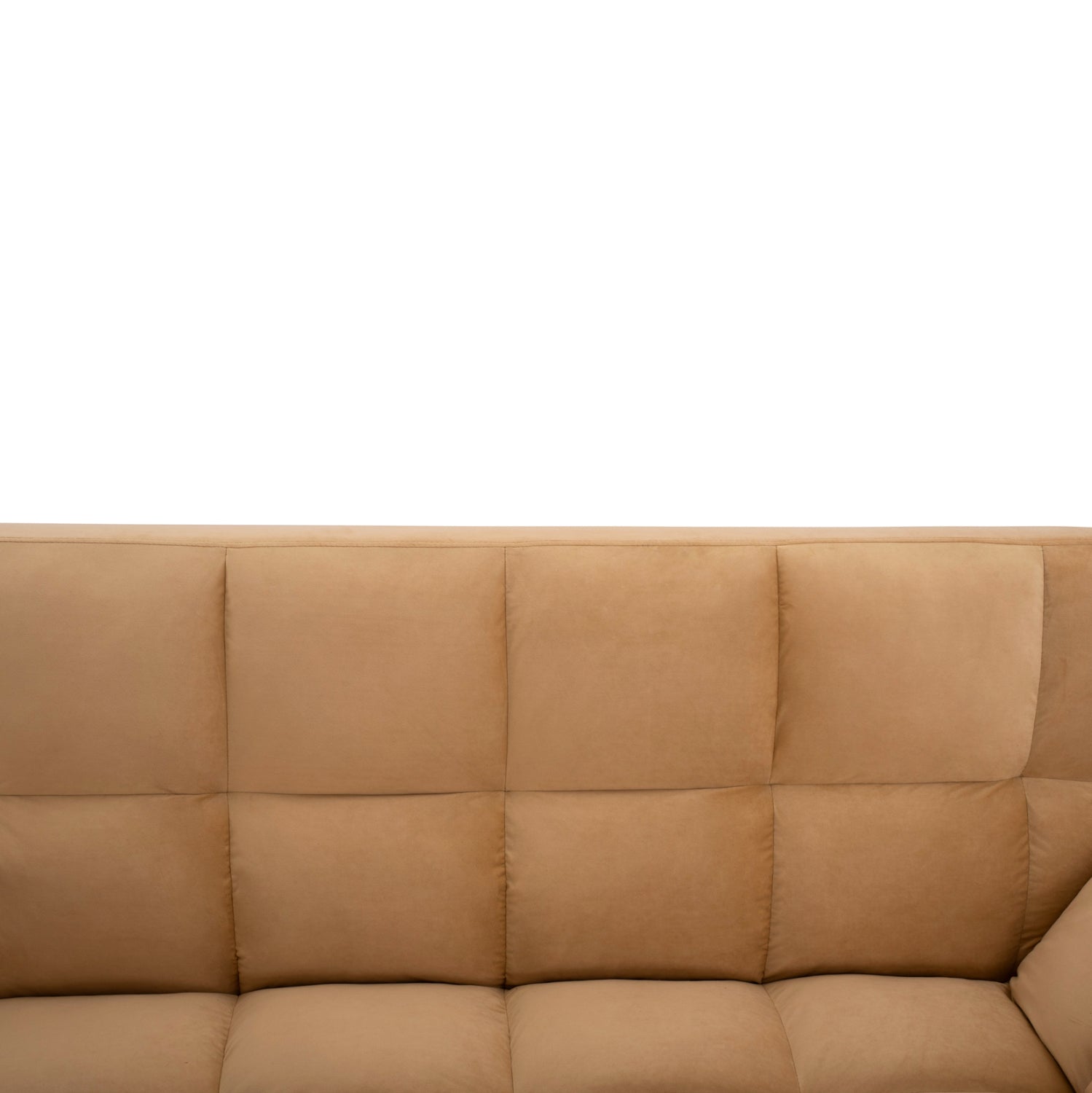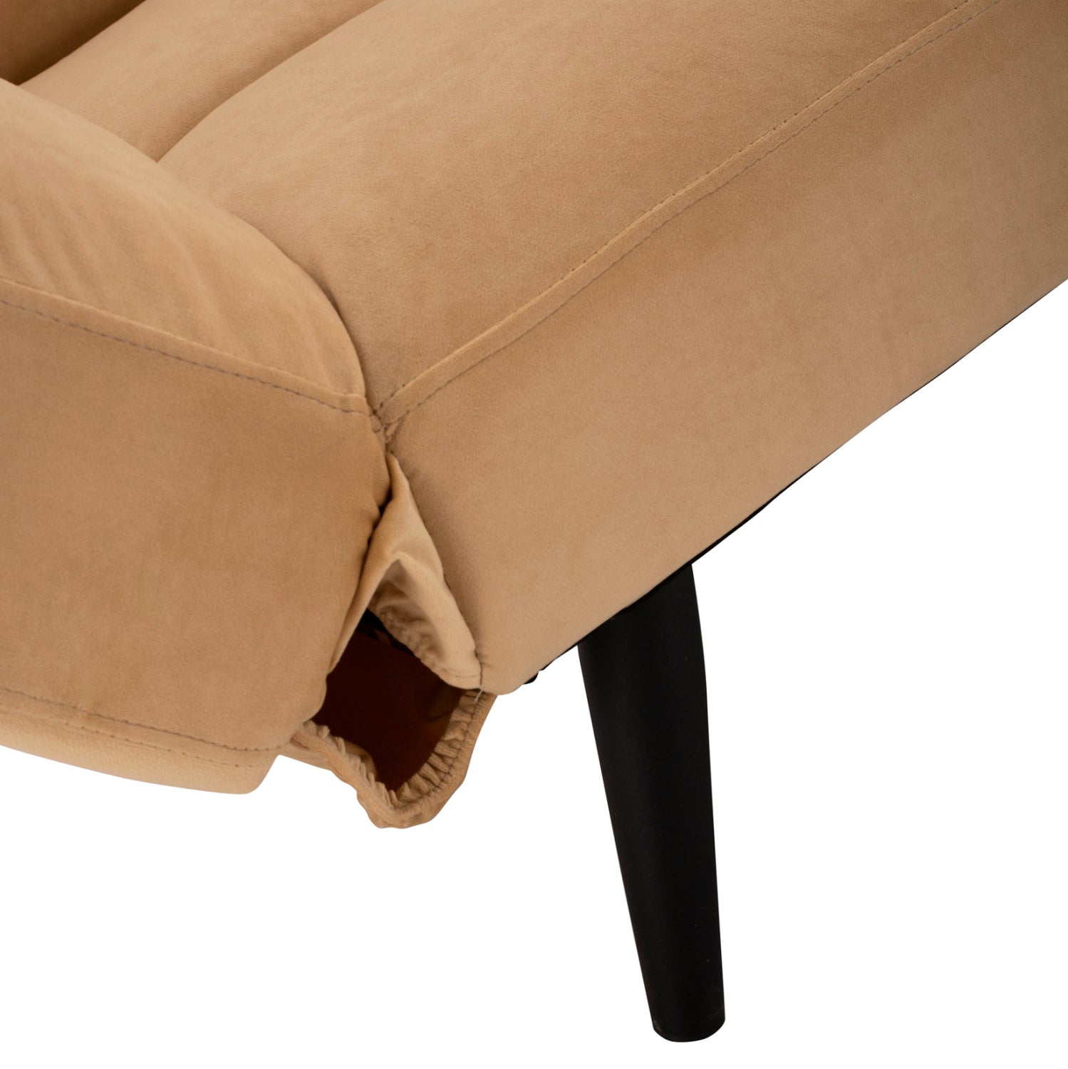 Μοντέρνος καναπές-κρεβάτι με πτυσσόμενα μπράτσα και ταπετσαρία από βελούδινο ύφασμα σε μπεζ χρώμα.
